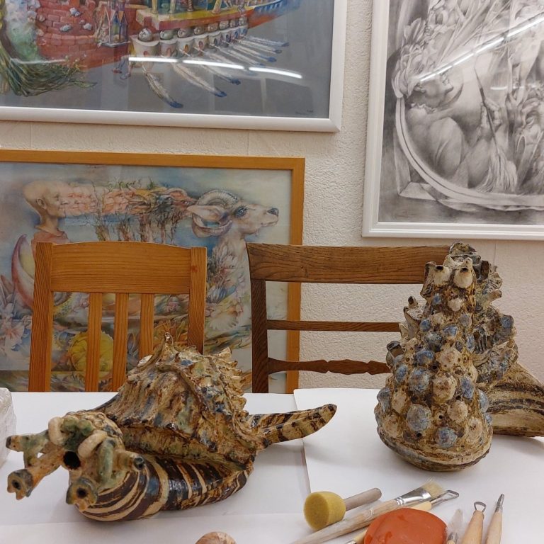 Auf den Bildern sind Kunstwerke zu sehen, die vor allem eines gemeinsam haben: Schnecken, die irgendwie anderes aussehen als die, die im Weinberg umherkriechen, viel bunter und interessanter. Diese Arbeiten, erzählt Annika Treiber den Kindern, stammen von Hermann und Christine Hoormann. Die beiden waren Künstler und hatten ihr Atelier im Hoormann-Haus in Bolanden. Schnecken haben die beiden Künstler immer wieder fasziniert, sie finden sich in vielen Werken der Beiden auf unterschiedliche Art und Weise wieder. Auch ihr Atelier haben sie wegen seiner gewundenen Treppe „Schneckenhaus“ genannt. Inspiriert von den Arbeiten zeichnen die Kinder nun selber: Auf den Skizzenbretten entwerfen sie mit Bleistift auf Papier die abenteuerlichsten Schnecken, denn bei einer Skizze ist schließlich alles erlaubt. Am Schluss werden die Blätter natürlich noch signiert, so wie bei echten Künstlern. Ehe Kurt und Annika sich verabschieden, laden die beiden die Kinder noch ins Hoormann-Haus ein.