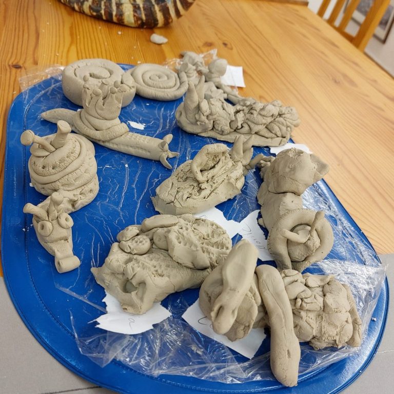 Weil so viel Kunst-gucken hungrig macht, gibt es im Anschluss an die Führung erst mal ein Frühstück und eine Tobepause im Freien. Danach geht es an die Arbeit, den nach dem Kunst anschauen kommt natürlich das Kunst machen! Mit Unterstützung ihrer Erzieherinnen formen die Kinder ihre eigenen, phantastischen Schnecken aus selbsthärtendem Ton. Dabei kommen allerlei Spannendes zum Vorschein: Eine Schnecke hat Stacheln, eine trägt eine Krone als Haus, eine dritte einen dicken Schal um den Hals und eine andere hat ein Haus mit ganz vielen Balkonen. Die Kinder strotzen nur so vor Ideen und jedes formt seine ganz eigene, individuelle Schnecke.